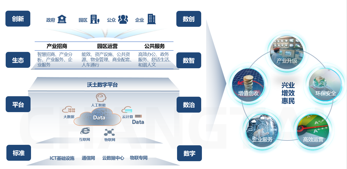 智慧城市/園區(qū)解決方案將各領域優(yōu)勢產品組合,以云數字平臺打造智慧城市/園區(qū)數字底座,實現南向連接標準化,北向應用服務化,解決客戶運營管理方面的痛點。以互聯網、物聯網等網絡組合為基礎,智慧技術高度集成、智慧產業(yè)高端發(fā)展、智慧服務高效便民為主要特征的城市發(fā)展新模式,利用運用先進信息和通信技術手段,實現智慧城市管理和運行,為城市中的人創(chuàng)造更美好的生活。